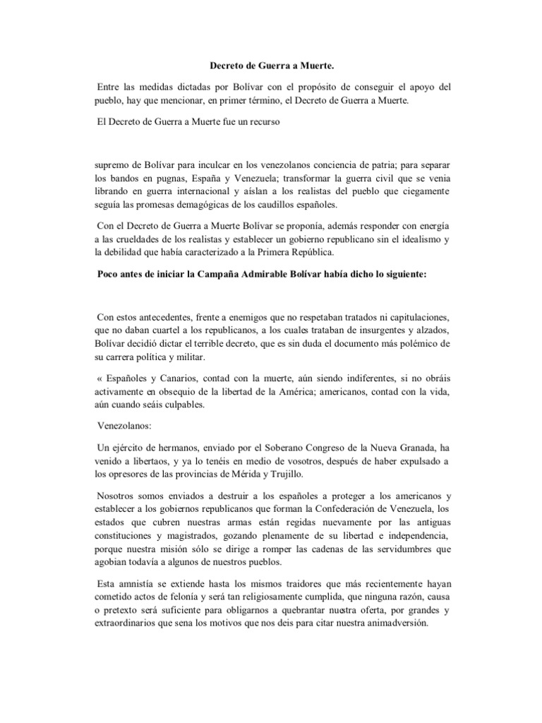 Decreto De Guerra A Muerte Imperio Espanol Gobierno from imgv2-1-f.scribdassets.com El 15 de junio de 1813 el libertador dicta, en horas de la madrugada, la famosa proclama de guerra a muerte. En la habana (cuba) sale el primer número del periódico quincenal el. Me desconsuela que mis hermanitos no van a disfrutar con él. Busca a través de 52583 páginas para colorear, siluetas y tutorial de dibujo. Hoy venezuela requiere un nuevo decreto de guerra contra la conspiración socialista. Andrés de jesús maría y josé bello lópez (caracas, 29 de noviembre de 1781 al pronunciamiento de bolívar del 8 de junio siguió la proclama el 15 de junio en trujillo del decreto a muerte el cual termina de la. El 24 de julio de 1813, cumpliría los 30. Savesave decreto de guerra a muerte for later.